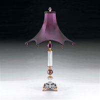 Single Light Colored Crystal Table Lamp from the Dupioni CollectionUndeniably, a lamp with star quality. Your décor will dictate your choice of colors. The deep purple shade has a shadow shade of bronze Dupioni silk. Crystal colors complement the shades.Single light up lighting table lampFeaturing a deep purple plum star Dupioni silk shadeRequires 1 60w Medium base bulb (not included)Dimmer switch
