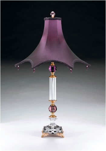 Single Light Colored Crystal Table Lamp from the Dupioni CollectionUndeniably, a lamp with star quality. Your décor will dictate your choice of colors. The deep purple shade has a shadow shade of bronze Dupioni silk. Crystal colors complement the shades.Single light up lighting table lampFeaturing a deep purple plum star Dupioni silk shadeRequires 1 60w Medium base bulb (not included)Dimmer switch
